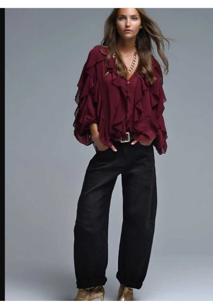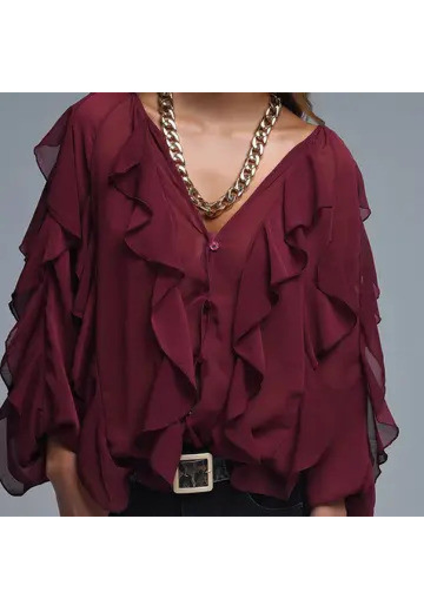 Blusa con volantes burdeos bot cuello V.
